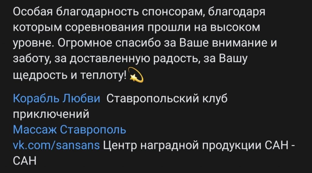 Компания “Сан-Сан” выступила наградным спонсором соревнований, предоставив кубки и медали для победителей и призеров. Поздравляем ребят, занявших призовые места! Вы – гордость Ставрополя!