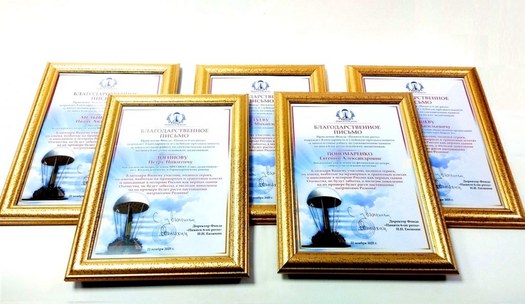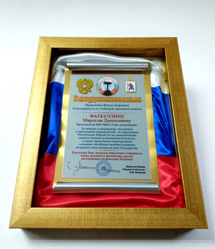 В знак признательности за многолетнюю работу по увековечению подвига 6-й роты псковских десантников, Игорь Евтюхин вручил благодарственные адреса, изготовленные компанией «Сан-Сан». «Сан-Сан» является многолетним наградным партнером Фонда, обеспечивая изготовление наград и атрибутики для мероприятий, посвященных памяти героев.