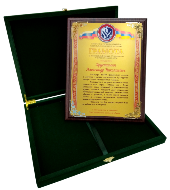 Благодарственные адреса и грамоты для общественной организации «Пятигорская армянская община»